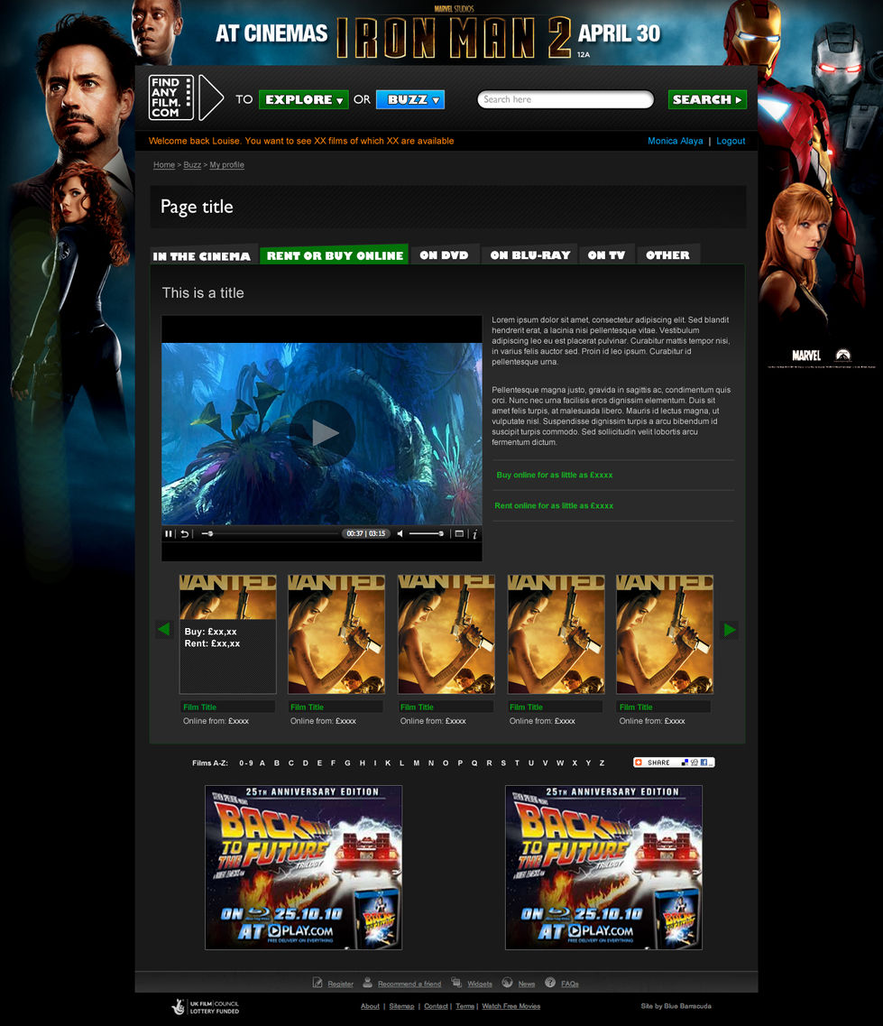 A collection of webpage designs and screenshots featuring movie-related content, including multimedia elements, character images, and promotional materials for movies and video games.